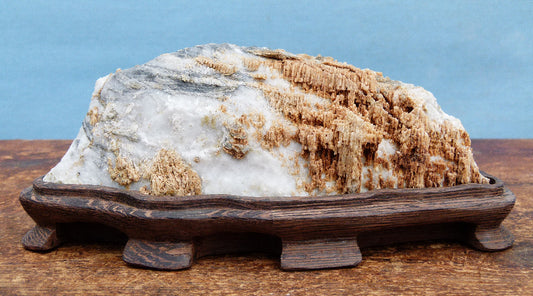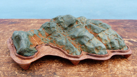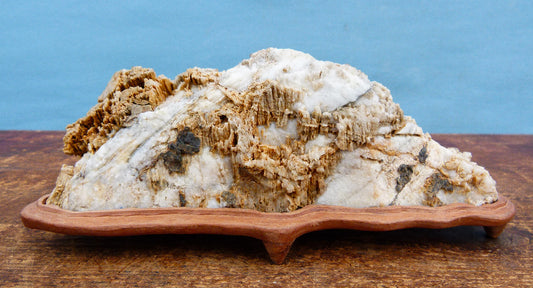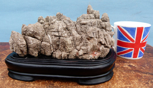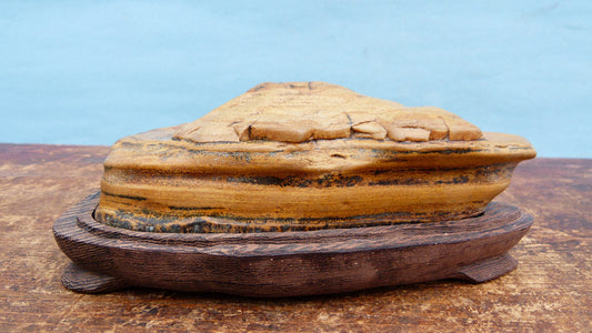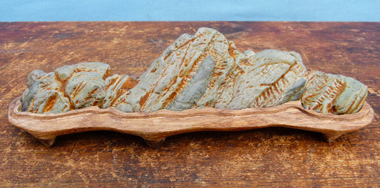 Suiseki are traditionally exhibited on a carved wooden base called “daiza” or in shallow trays called suiban or doban. When formally exhibited, suiseki are often accompanied by bonsai. Conversely Suiseki are often used as accents to a bonsai on display in a formal setting. The term suiseki means literally “water stone”. It is derived from the ancient custom of displaying miniature landscape stones in trays filled with water and from the association between suiseki and classical Oriental landscaping paintings of mountains and lakes.