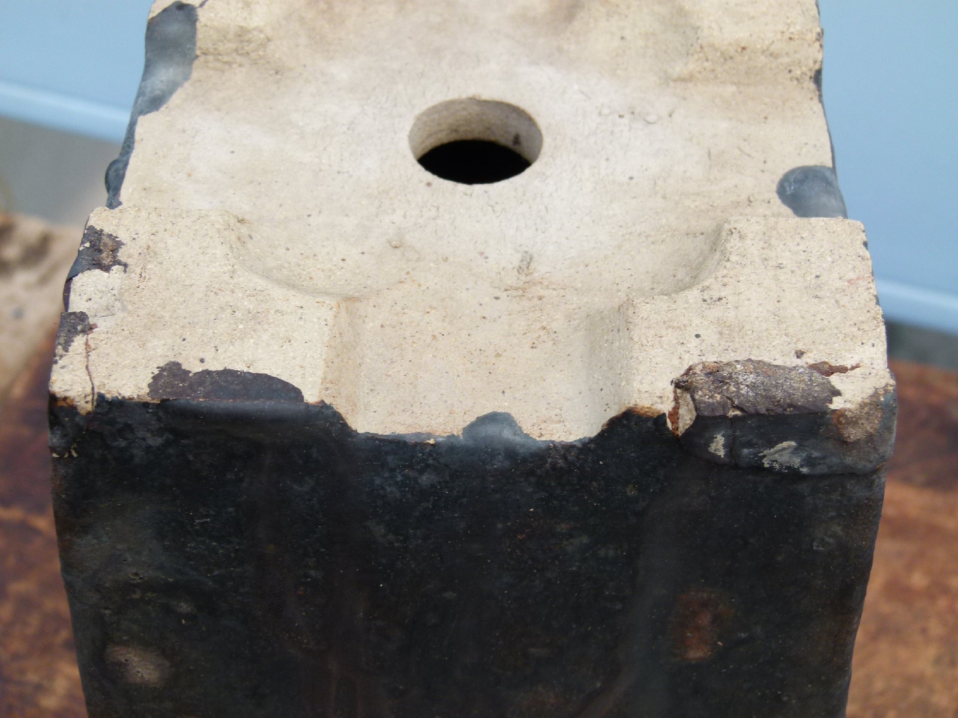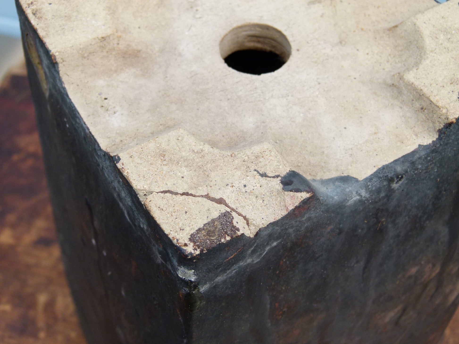 This Charles Miller pot looks like it stuck to the kiln shelf when fired as the feet have been repaired, probably by Charles himself. It's not the first time we have seen this. Rest of the pot looks good in it's nice matt black/brown glaze.
