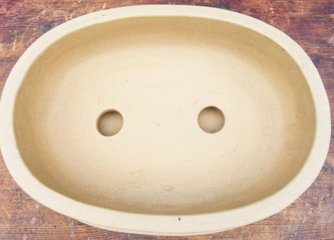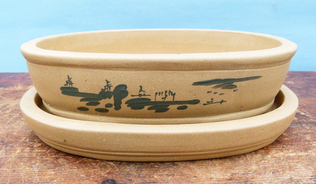 Decorated Oval Unglazed Bonsai Pot With Under Tray