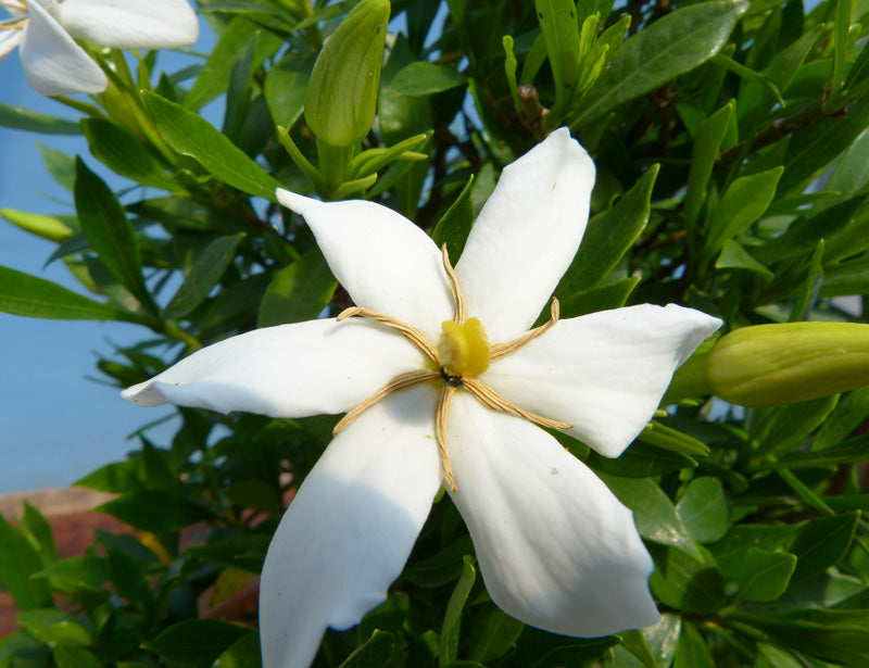 We believe this to be Gardenia augusta Radicans which is a dwarf form of this incredibly broad genus of 200 or more species mainly from Asia or Southern Africa. It has deep green narrow leaves and highly fragrant cream flowers. Gardenia should be overwintered in a cold greenhouse or unheated conservatory but can be outside in milder areas. Gardenia likes a well ventilated bright and humid situation in order to thrive. Keep gardenias well watered and fertilise regularly when in active growth.
