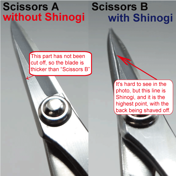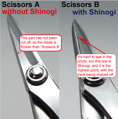 These scissors also feature 'Shinogi'. The blades are shaped, ground and polished to retain the strength of the blade whilst reducing it's mass significantly. This greatly improves the ability of this powerful tool to perform delicate and accurate cuts whilst still being very strong and capable of cutting thicker twigs and small branches.