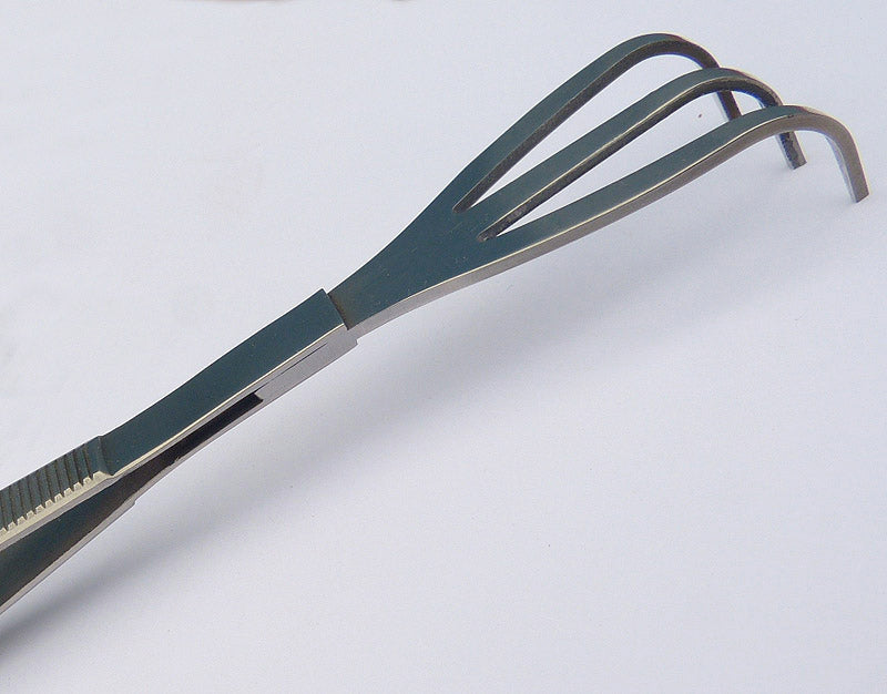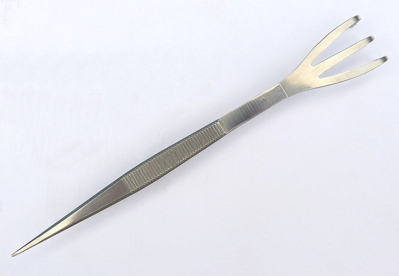 A combination of rake, useful for Bonsai repotting, and a long straight tweezer for cleaning out congested foliage.