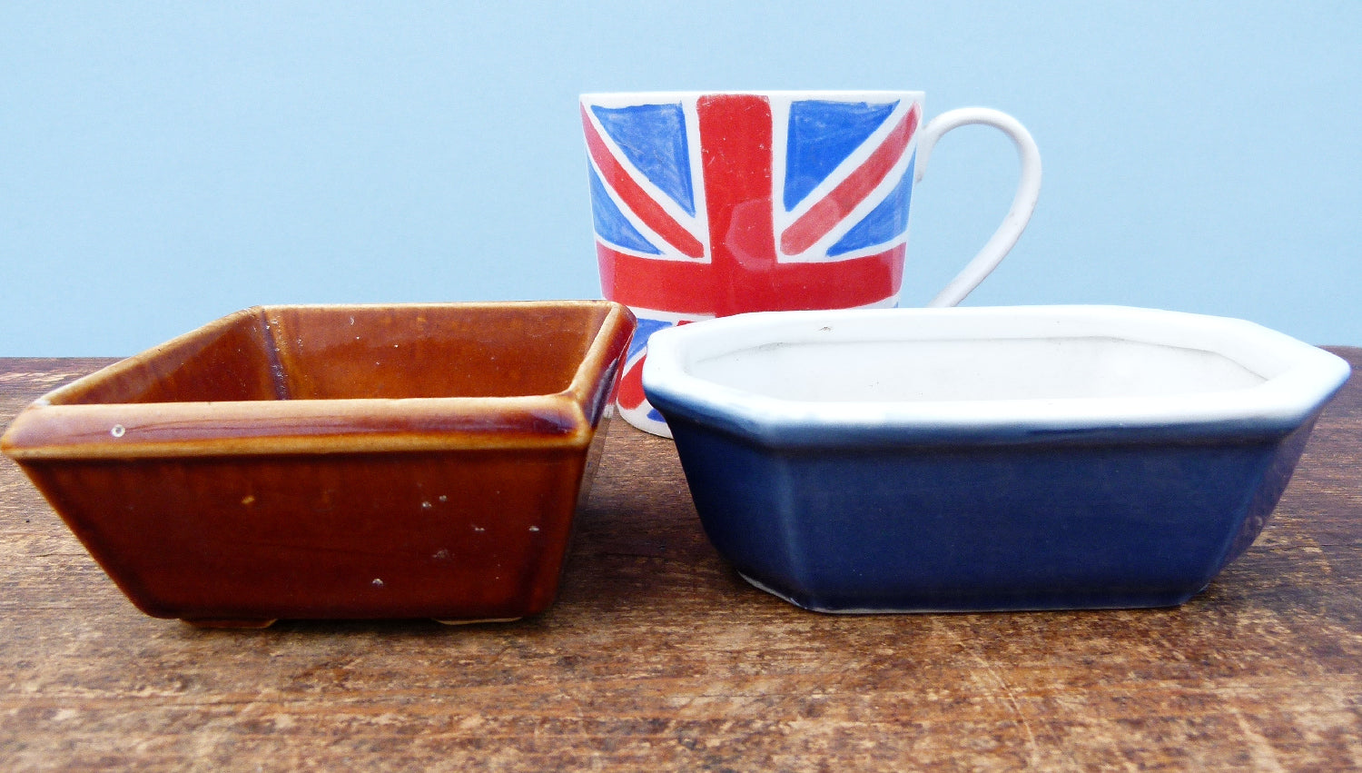 A random selection of pots including one very nice handmade item. Looks like a couple have had drainage holes drilled into them. The items in the pictures are exactly what we will send you.