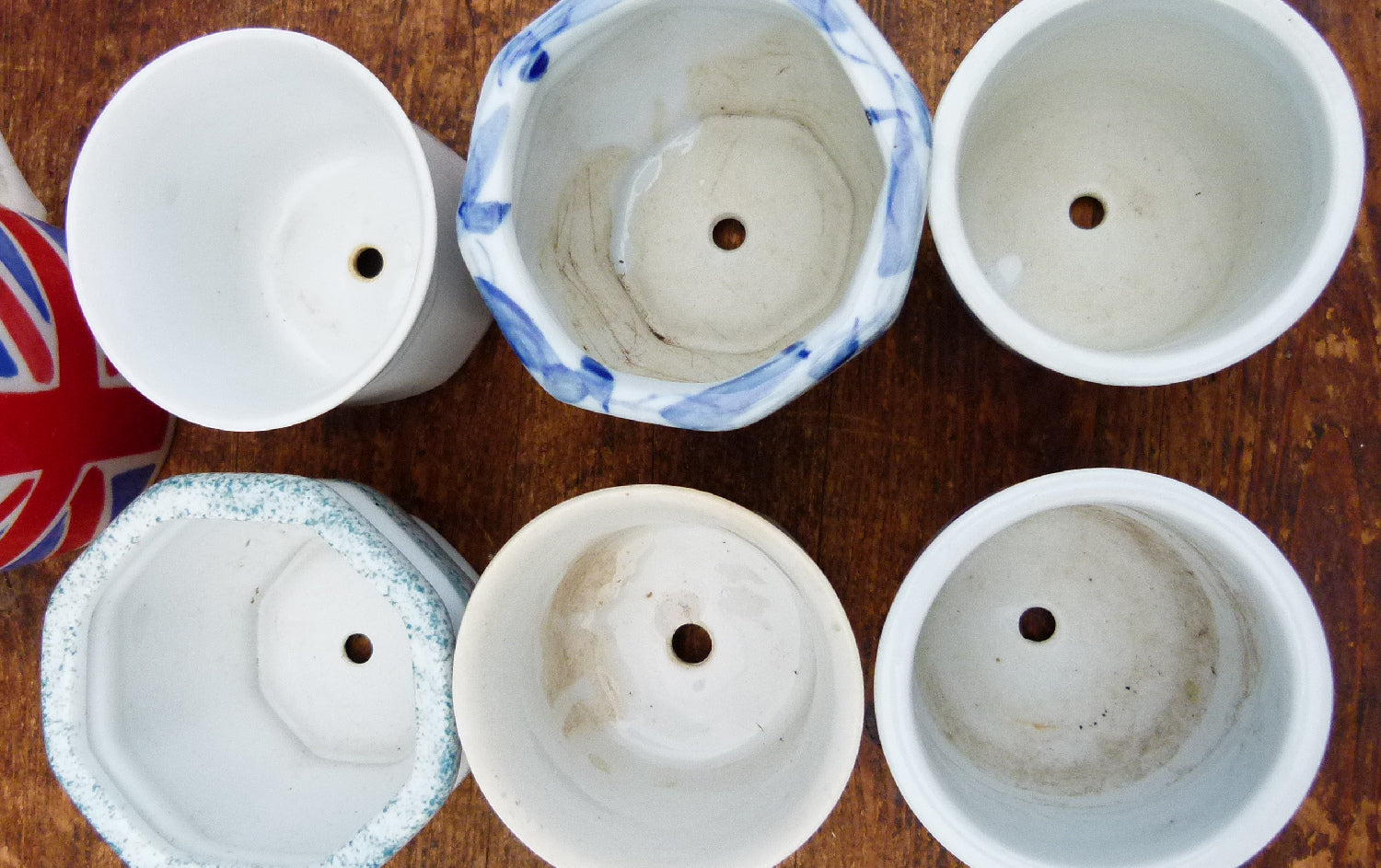 A random selection of pots in white clay and porcelain. Looks like a couple have had drainage holes drilled into them. The items in the pictures are exactly what we will send you.